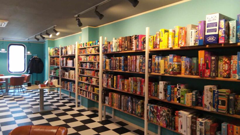 入り口から入ると、最初に目につくのが店内にある大量のボードゲームやカードゲームの数々。鮮やかなブルーが基調の壁に、チェスを思わせるような白黒のチェッカーフロア。4人がけのテーブルがいくつもあり、ゆったりとした店内で、寛ぎながらゲームに集中できる。