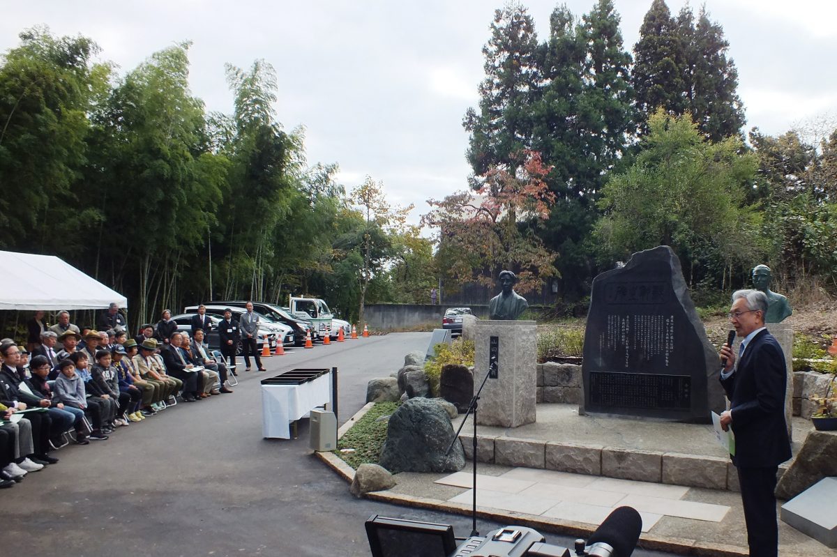 この事業は100年前に市民の有志「令終会」が整備した悠久山公園が100年の節目を迎えたことを記念し、実行委員会が、令終会設立の中心となった山田又七、田村文四郎二人の胸像と顕彰碑などを公園内に設置したもの。