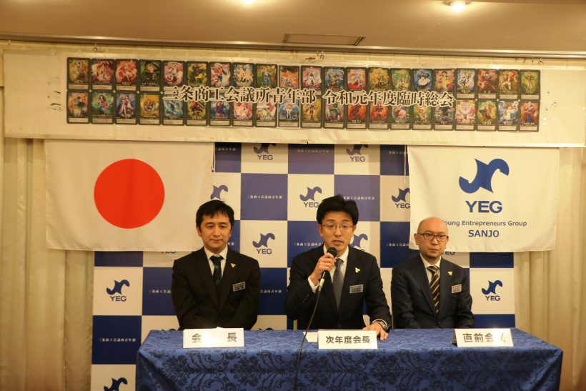 三条商工会議所青年部(三条YEG)は24日、三条市内で臨時総会を開催し、江戸川産業代表取締役・新保智也氏の次年度(令和2年度)の会長就任、次年度の基本方針、事業計画、組織構成案を了承した。