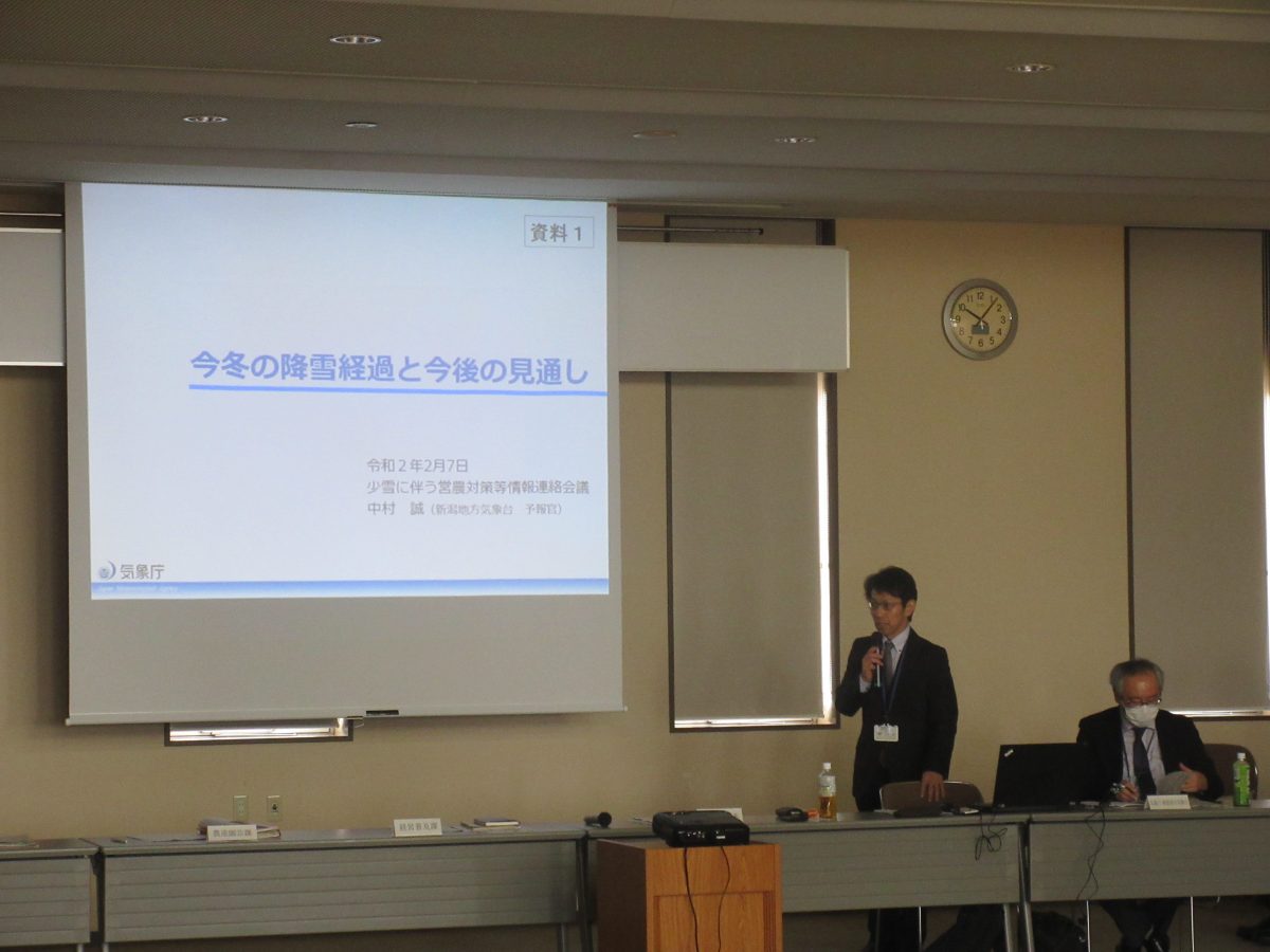 新潟県農地部・農地計画課長の佐藤孝明氏によれば、今年は例年にない暖冬・少雪であり、上中越の5地点の積雪が1月末時点でゼロという状況で、積雪量がいずれも平年の4分の1程度で推移しているという。佐藤氏は「現時点で春の農作業にどの程度影響が出るか不透明だが、少雪が続き、春先以降も降雨が少ないことが予想される。本日の会議を踏まえて、各地域でも関係機関を集めて情報を共有し、地域の実情に即した対応を検討いただきたい」と話した。