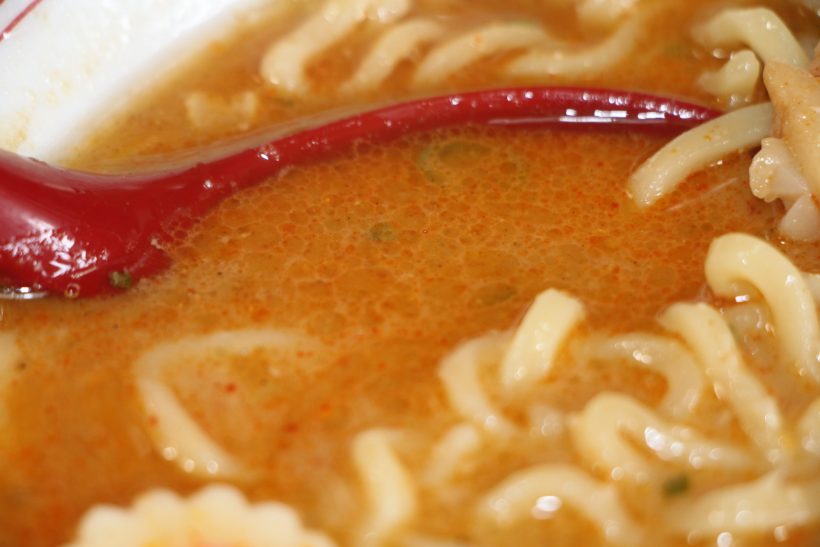 それではそろそろ、からみそ行っちゃいますか。スープに溶くとさっと赤みが広がる。れんげですくって一口、おおっこれはこれは。美味いわ。辛みが美味い。スープに輪郭が出る。記者は特別辛いのが好きなわけでもないが、そこそこ耐性はある方。3はちょっと日和り過ぎだったか、もう一段階辛くても良かったかな。いや、後からじわじわ辛みが来る。額にうっすら汗がにじむ。気持ち良くて、すっかりスープを飲みほした。