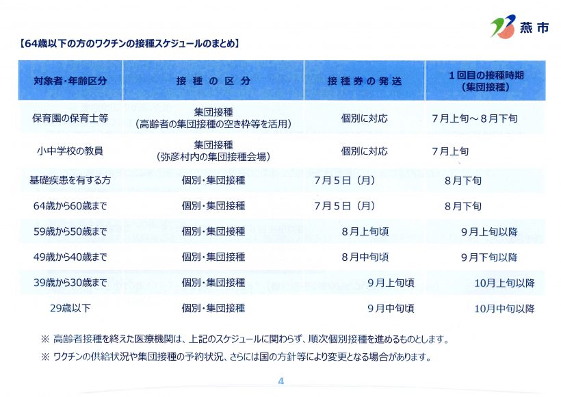 燕市は現時点で、65歳以上の高齢者の接種予約率は7日時点で9割を超えており、7月末までに高齢者の接種が完了する見込みである。8月以降は、基礎疾患の有無や年齢で細かく区分し、最終的に11月末までに全市民への接種を完了させる予定だ。