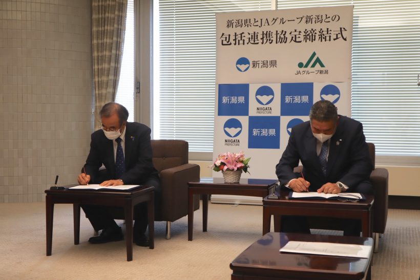 新潟県とJAグループ新潟は10日、県民サービスや地域活性を目的とした包括連携協定を結ぶための締結式を開き、新潟県の花角英世知事と、JAグループ新潟を代表してJA新潟中央会の今井長司代表理事会長が出席した。
