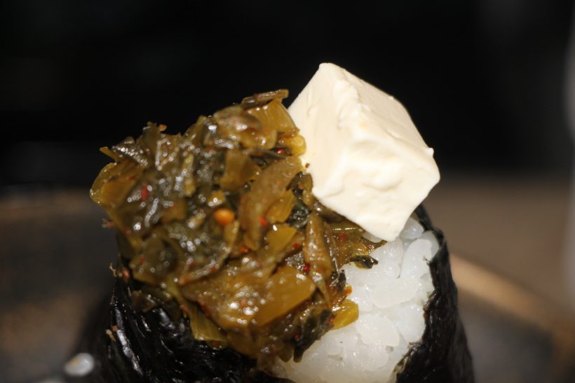 おにぎりだけにさほど時間かからず着皿。上にちょこんとキューブのクリームチーズ。しかしここのおにぎりは一個がデカいね。余裕で茶碗一杯、下手したらそれ以上にある。
