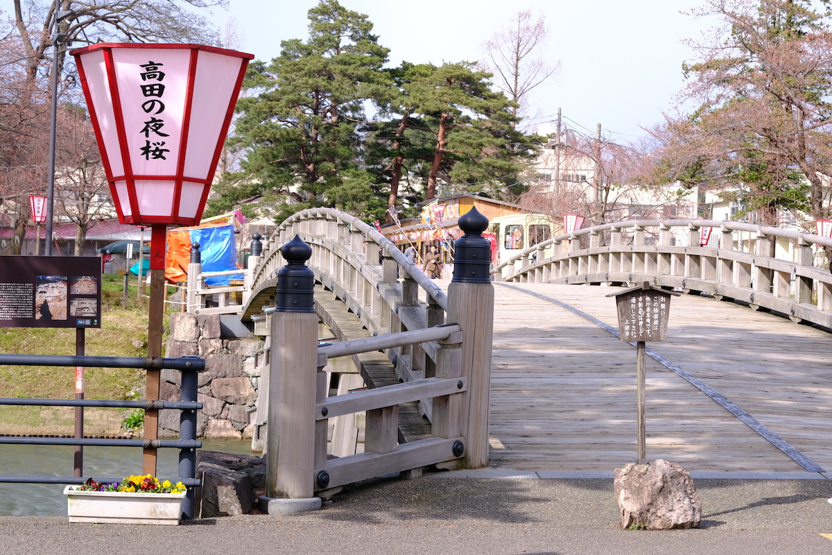 高田公園の桜の歴史は、在郷軍人団が城跡に2200本の桜を植樹したのが始まり。現在桜は高田公園やその周辺を含めて4000本あり、そのほとんどがソメイヨシノ。たくさんのぼんぼりに照らし出され、堀の水面に映る様は「日本三大夜桜」の一つに数えられている((一社)夜景観光コンベンションビューローが「高田城」「大阪城」「高知城」を日本三大夜城に認定している)。また高田公園は「さくら名所100選の地」、「日本の歴史公園100選」にも選定されている。