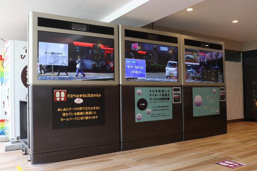 デジタルサイネージとは、表示にデジタル技術を活用し平面ディスプレイやプロジェクタなどによって映像や文字を表示する情報・広告媒体。今回同社が商用利用を開始したデジタルサイネージは、5G通信利用のほかに、A Iを利用した顔認証システムや、特定の範囲のみに音を流すことができる超指向性スピーカーなどが搭載されている。