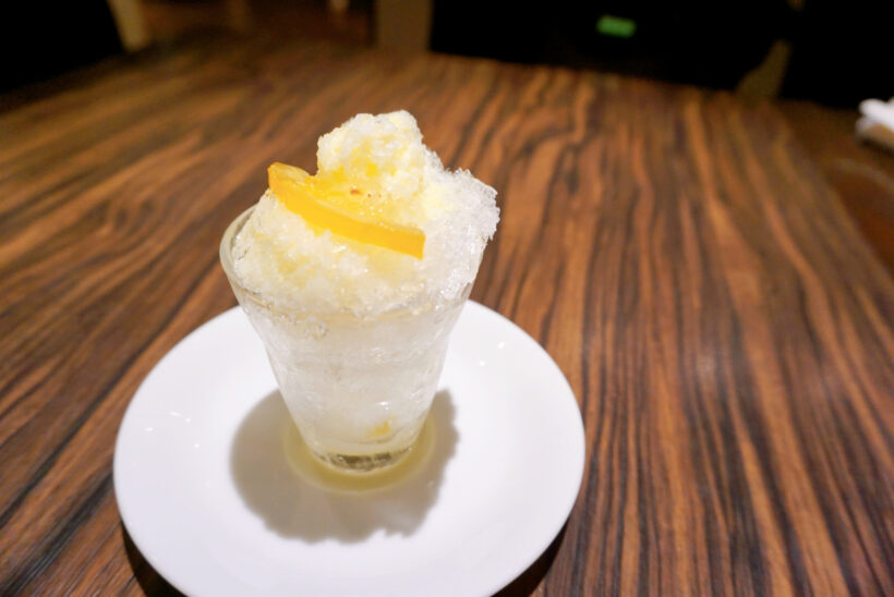 なかでも印象的だったのは、シェフがその場で削ってくれるレモンフラッペ。シャリシャリとした食感と、爽やかなレモンの香りがふわっと広がって、ついつい手が伸びる。レモンのシロップ漬けがちょこんと飾られていて、見た目も味もほんのり贅沢な感じ。雨の日でもしっかり夏を感じられる爽快感で、暑い日だったらもっと最高だったかもしれない。
