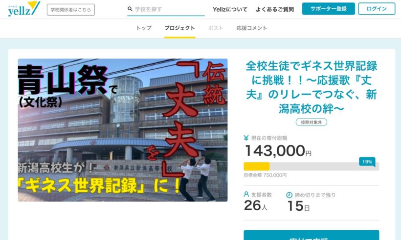 県立新潟高等学校(新潟市中央区)生徒会執行部が9月11日から、オンラインコミュニティサイト「Yellz」でギネス世界記録挑戦のための費用の寄付を募っている。プロジェクトの目標金額は75万円。受付期間は、9月26日まで。