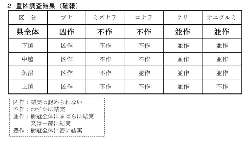 新潟県農林水産部鳥獣被害対策支援センターは9月26日、堅果類豊凶調査の結果を発表した。