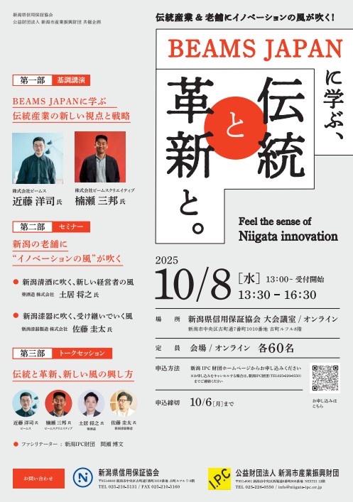 新潟県信用保証協会は10月8日、新潟市産業振興財団と共催で、伝統産業と老舗企業に革新を取り入れるビジネスセミナーを開催する。会場は、同協会本店大会議室(新潟市中央区)で、オンライン参加も可能。