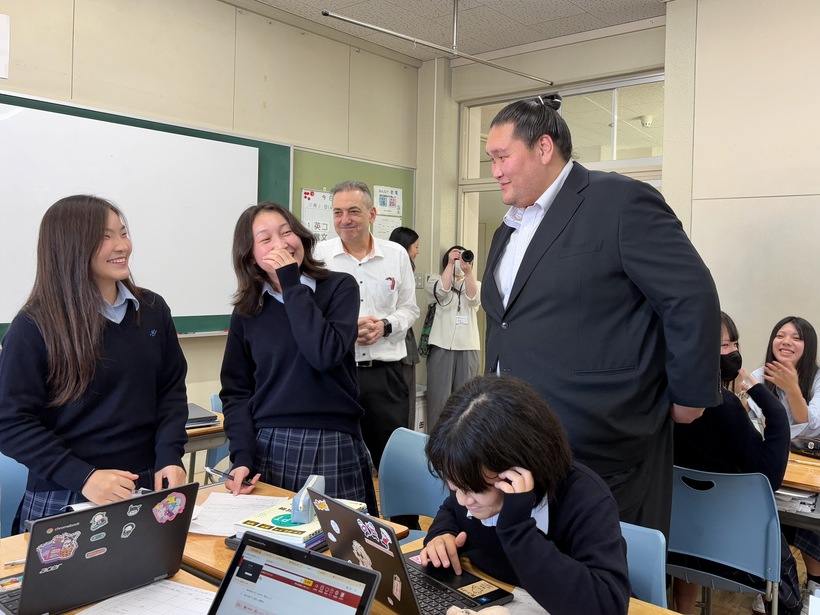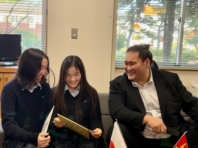 大相撲の伊勢ヶ濱親方が新潟青陵学園を訪問、モンゴル留学生らと笑顔の交流