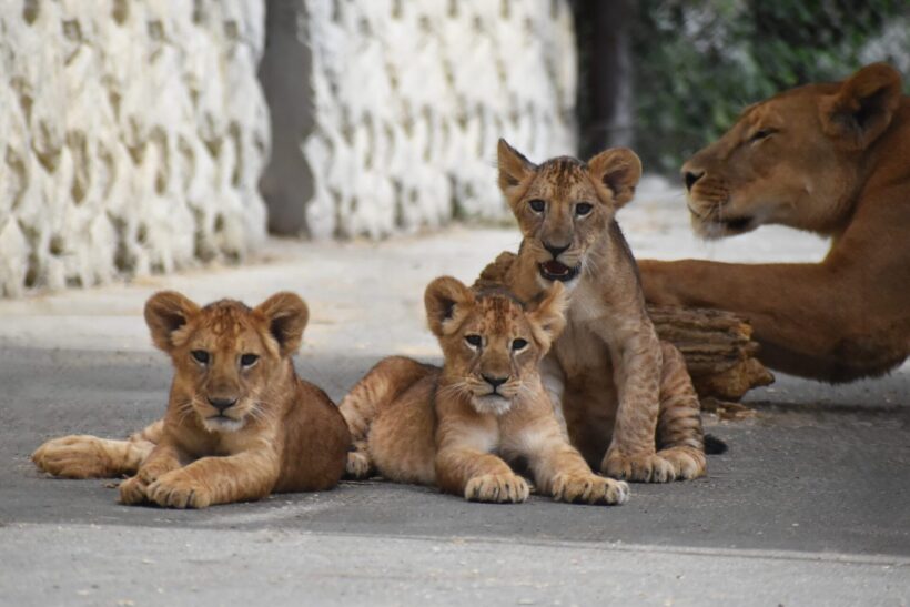 群馬サファリパークで5月に生まれた仔ライオンと母親(画像はプレスリリースより)
