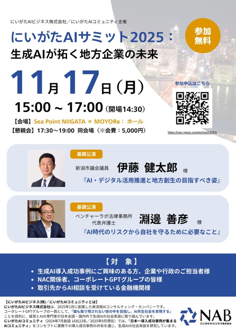 にいがたAIビジネス株式会社(新潟市中央区)はこのほど、11月17日に「にいがたAIサミット2025 生成AIが拓く地方企業の未来」を、新潟市中央区のSea Point NIIGATA×MOYORe ホールで開催すると発表した。
