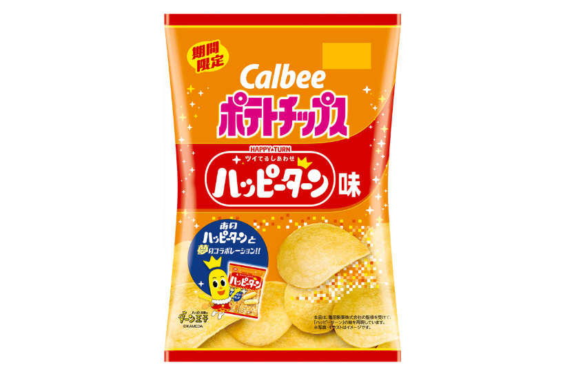カルビーから発売する「ポテトチップス ハッピーターン味」(65グラム、想定価格税込み190円前後)は、亀田製菓の監修のもと約1年をかけて開発した。井上氏は「食べた瞬間の自然な甘みを大事にしながら、ライスパウダーを使用することで米菓の風味を再現した」と説明。パッケージにはハッピーターンのロゴやブランドキャラクター「ターン王子」を掲載し、一目でコラボレーションと分かるデザインに仕上げた。コンビニエンスストア以外の店舗では10月20日から数量限定で発売する。