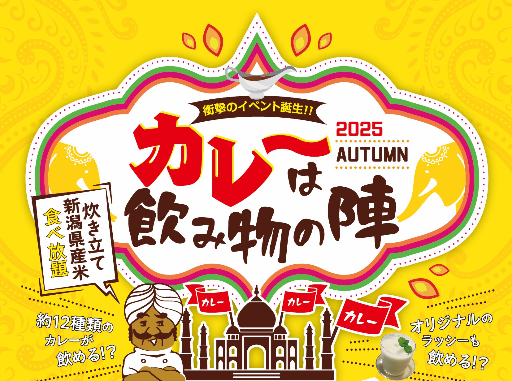 10月18,19日の両日、弥彦村のヤホールで「カレーは飲み物の陣2025」が開催される。これまで新潟市の万代シテイパークや三条市のたいぶんを舞台に展開されてきたイベントだが、満を持して今年は弥彦に出陣だ。
