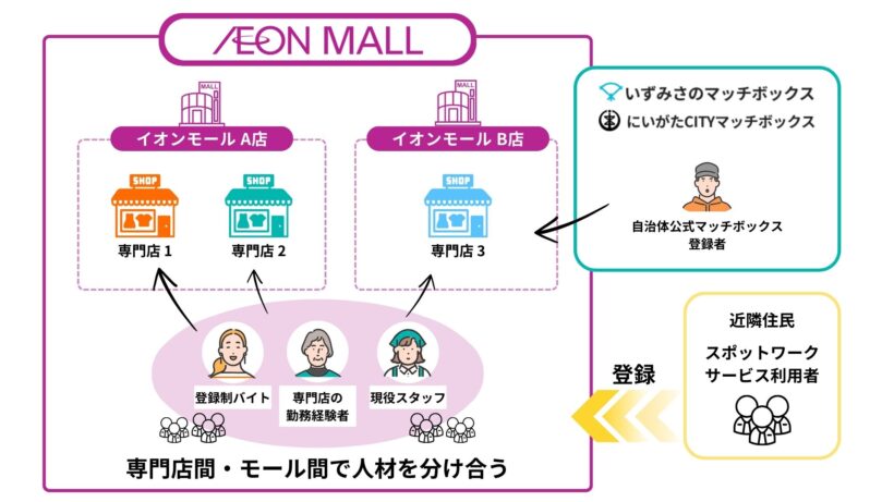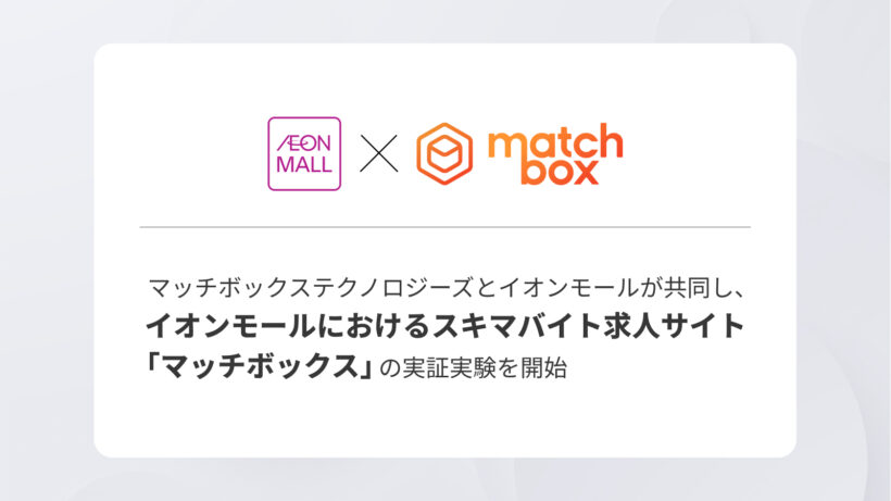 株式会社Matchbox Technologies(新潟市中央区)とイオンモール株式会社(千葉県千葉市)は、イオンモール内の専門店における人材確保と柔軟な働き方の推進を目的に、スキマバイト求人サイト「マッチボックス」を活用した実証実験を10月16日から約6カ月間実施する。