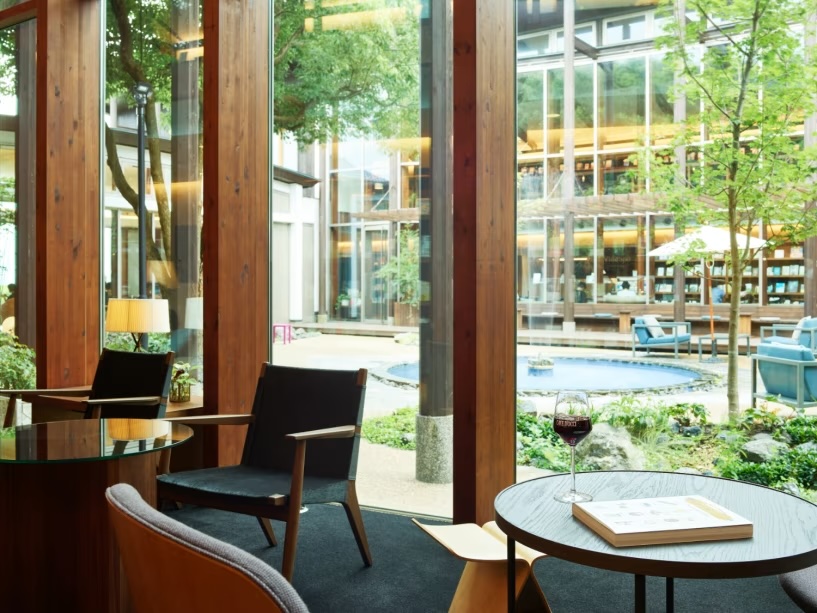 新プラン「気軽でお得!温泉&ランチプラン【タオルセット付き】」は、カーブドッチの温泉とブックラウンジを楽しむことができるプラン。温泉は露天風呂と内湯、サウナを備え、食事の前後どちらでも利用できる。