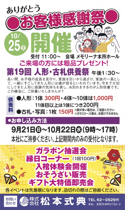 縁日や入棺体験など盛りだくさん! メモリーナ本所ホール(新潟県見附市)で松本式典が感謝祭開催 人形・古札供養祭も