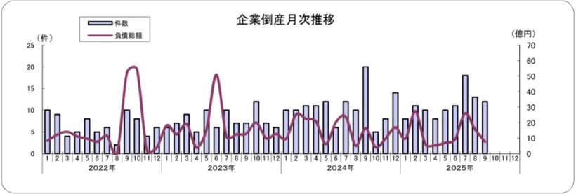 株式会社東京商工リサーチ新潟支店は10月2日、2025年9月度の新潟県企業倒産状況を発表した。県内の企業倒産件数(負債総額1,000万円以上)は12件、負債総額は7億7,200万円で、5カ月連続の2桁倒産となった。