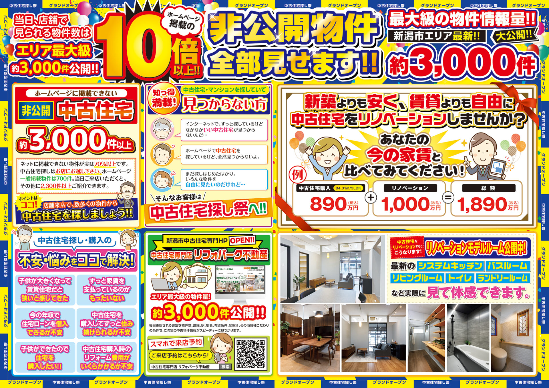 株式会社ユウワ(新潟市東区)が運営する中古住宅とリノベーション専門店「リフォパーク不動産」がこのほどオープンした。地域最大級となる約3,000の中古物件の情報を公開する同店は、グランドオープンを記念し「中古住宅探し祭」を、10月18日・19日、11月1から3日の合計5日間に開催する。