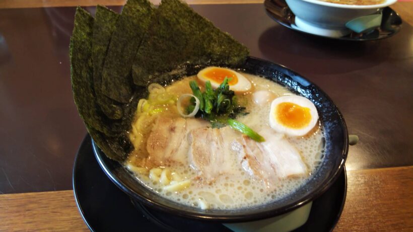 白濁したスープの上に浮かぶ厚切りチャーシュー、鮮やかなほうれん草、そしてとろりと輝く半熟味玉。丼をぐるりと囲む大きな海苔が、まるで船の帆のように存在感を放つ。