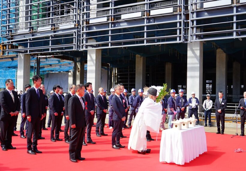 式典には、同社中山哲也代表取締役社長のほか、設計を担当する株式会社日建設計の佐藤健常務執行役員、施工を担当する鹿島建設株式会社の木村淳二執行役員(北陸支店長)らが出席。