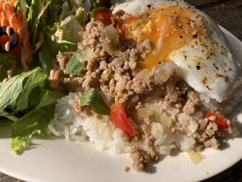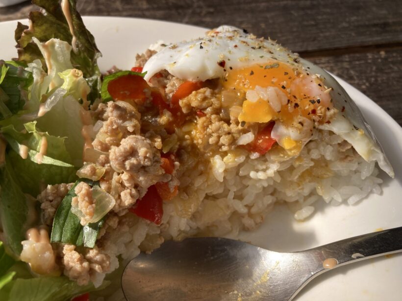 これまで食べたことはなかったが、名前が気になり、事前にネットで調べた。タイ料理で、ひき肉と目玉焼きが乗っているらしい。ネットの写真がおいしそうだったので、注文すると決めていた。