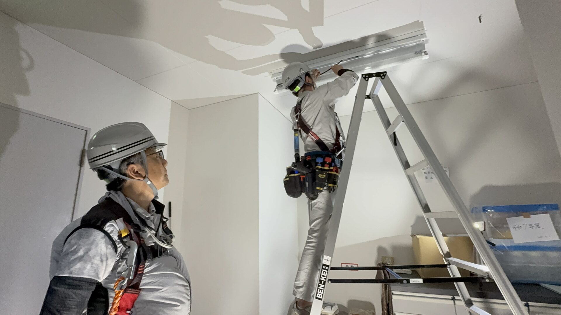 取材当日、五十嵐さんが現在担当しているという、公共施設でのLED化工事現場を訪問した。約280台の照明を交換する2カ年計画の大規模プロジェクトだ。基本2人1組で作業し、電線を専用工具で結線し、絶縁テープを巻いていく。時に先輩社員からアドバイスをもらいながら、一つ一つの照明を丁寧に取り付けていく。