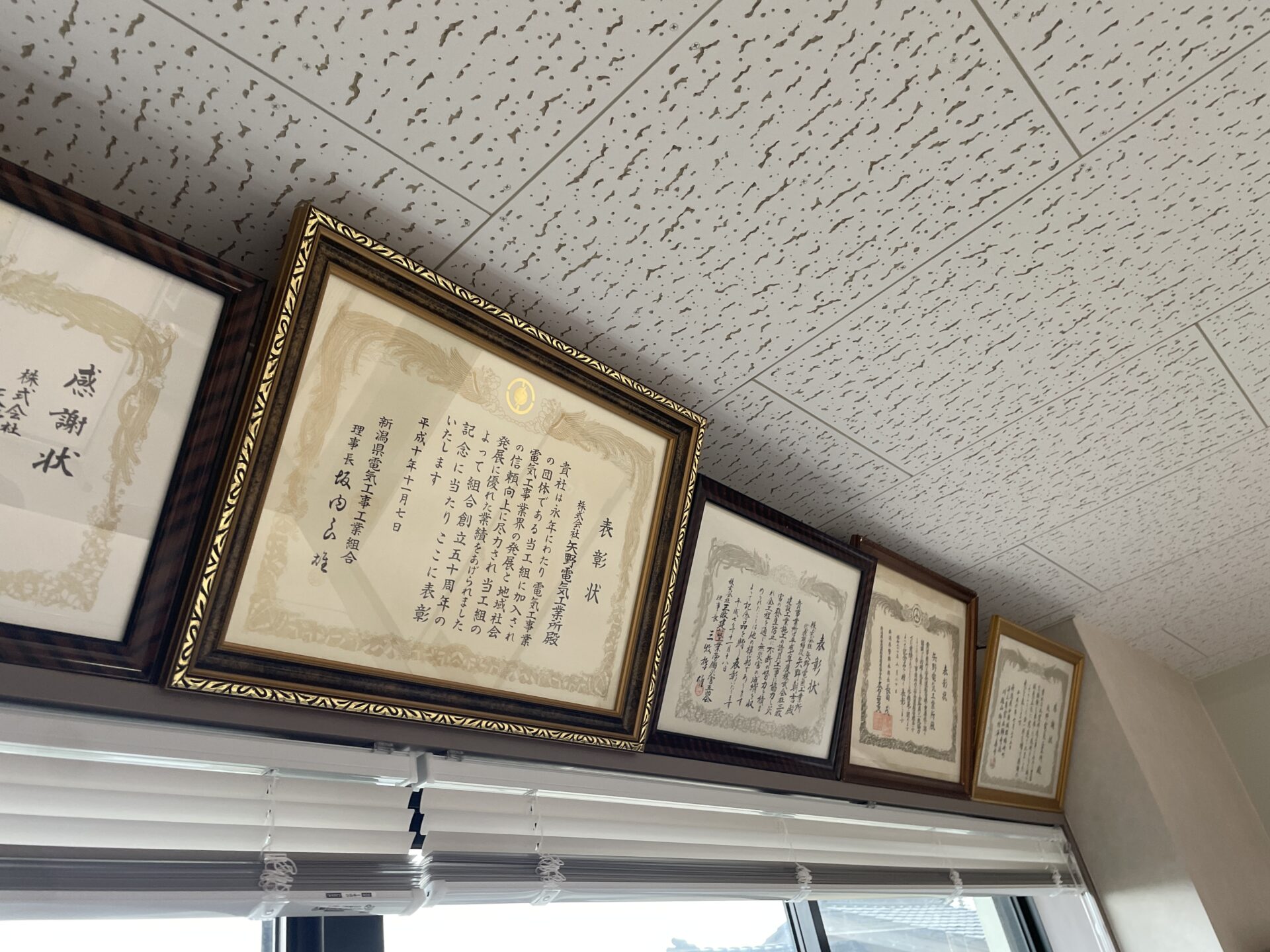 担当者が各現場を継続的に受け持ち、新築時の施工から保守点検、修理に至るまで、建物のライフサイクル全体をサポート。同社に掲示された多数の感謝状は、長年にわたる技術力と対応力への評価を物語っている。