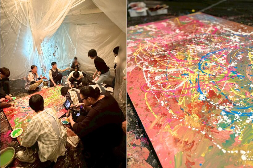 会場には、3人のアーティストによる作品をテキスタイルに落とし込んだ「キモノローブの mirage シリーズ」3着と、3人のアーティストによるそれぞれのアーティストの作品を展示し、「Black/kanvas」のコンセプトを表現した。また、巨大な黒いキャンバスを設置し、子どもから大人まで誰でも参加できるライブペイントを2日間にわたり実施。参加者は手で絵の具を塗ったり、色を混ぜたりと、自由に描く行為そのものを楽しんだ。
