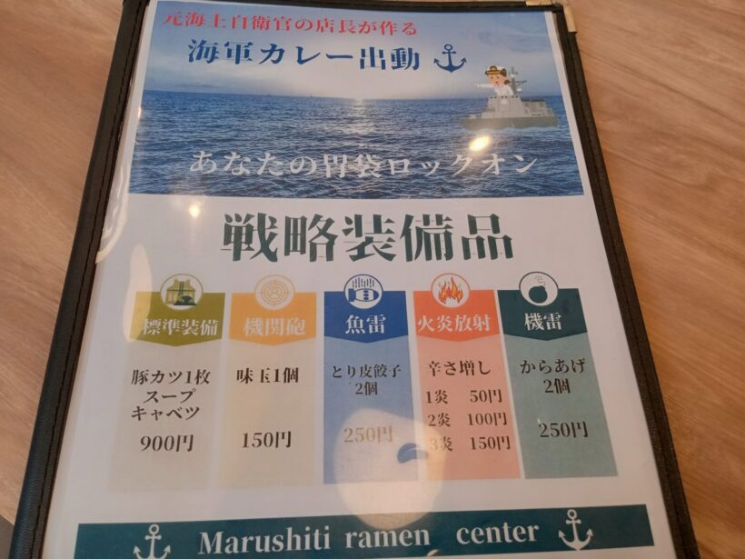 メニューにはさらに「戦略装備品」の欄があり「機関砲」(味玉)、「魚雷」(とり皮餃子)、火炎放射(辛さ増し)、「機雷」(からあげ)などのトッピングが書かれている。ここは「魚雷」(とり皮餃子2個、250円)を実装で火力アップだ。ちなみに海軍カレー(900円税込)は「カツカレー +スープ+キャベツ」が標準装備だから。