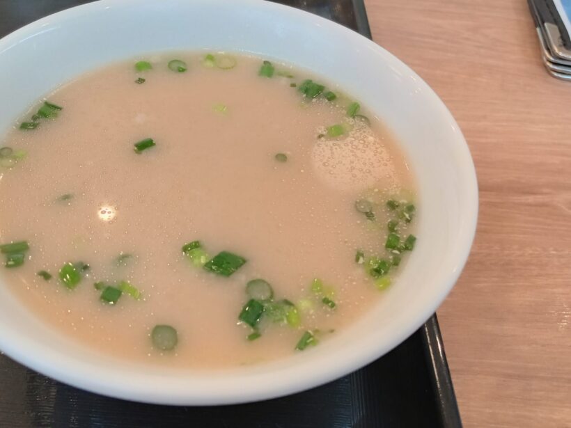 カツも揚げたてサクサク。添えられたキャベツが良いアクセントに。最高だ。加えて、付属された豚骨スープがまあ美味い。好きな味だなぁ。今度絶対ラーメン食べにこよ。