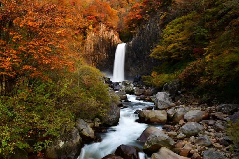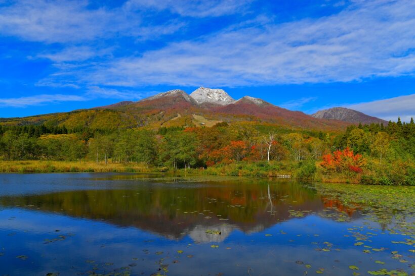 このエリアには、紅葉の名物スポットがいくつも点在している。有名なところで言えば、日本有数の名瀑として知られる苗名滝、標高1,300メートルの雲上の楽園・笹ヶ峰高原、妙高山の姿が水面に映るいもり池など。全長3,000メートル超の妙高杉ノ原ゴンドラに乗って、色鮮やかに染まった山を見下ろすのもおすすめだ。