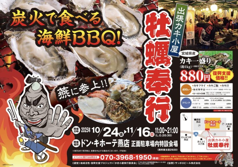 ドン・キホーテ燕店正面駐車場内の特設会場で、10月24日から11月16日まで「出張カキ小屋 牡蠣奉行」が開催される。備長炭の炭火を使ったセルフBBQで、浜焼きなどを気軽に楽しめる。開催時間は、期間中の11時から21時まで。