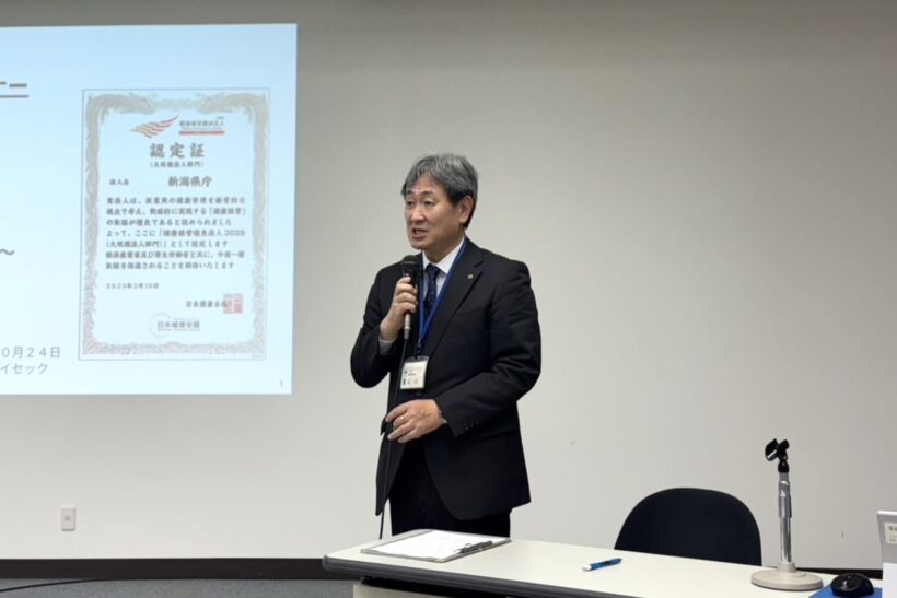 新潟県は10月24日、職員向けに「健康経営セミナー」を開催した。講師には株式会社アイセック(新潟市中央区)の木村大地代表を招き、管理職らが健康経営の意義や課題を学んだ。