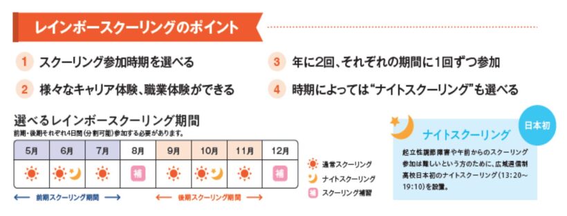 レインボースクーリングは、朝の時間帯、昼間、夜間など、複数の時間帯から選択できるシステム全体を指す。その中でナイトスクーリングは、13時20分から19時10分までの時間帯で授業が行われ、英語や数学といった座学・実習に加えて、キャリア体験学習や職業体験も同じ時間帯で実施される。