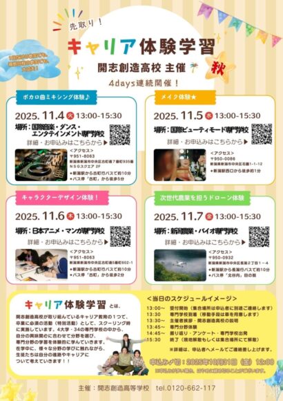 また同行では11月4日(火)〜7日(金)にかけて、4日間連続キャリア体験ができるイベント「先取り!キャリア体験学習」を開催する。新潟市内の専門学校と連携し、多彩なプログラムを体験できます。