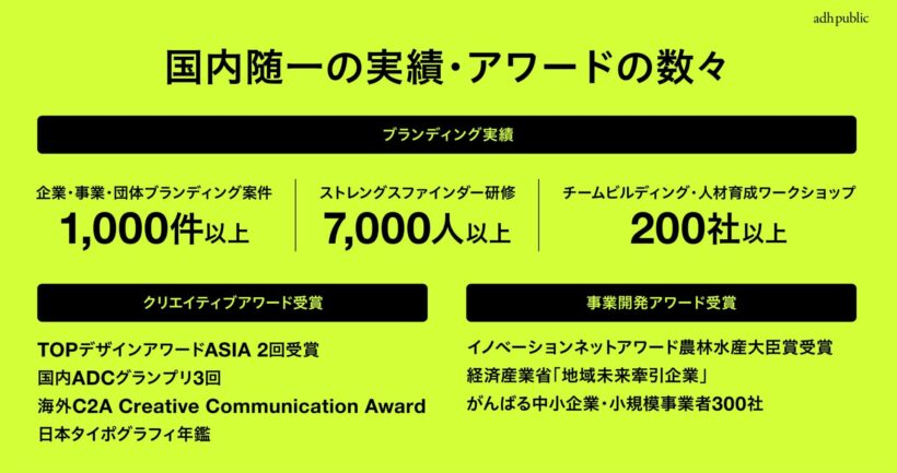 二つ目が、経験豊富な経営とブランディングのヒストリーにある。アドハウスパブリック自体、創業1974年という50年以上の歴史があるデザイン会社で、関本氏が入社した25年前は下請け的側面が強く、経営的視点が弱かったそう。そこから四半世紀の時間をかけて、個人としても企業としても高め合い、より良いクリエイティブ力を発揮できる会社になることを目指して関本氏自身が経営に取り組んできた経験が、クライアントの悩みに解像度高く寄り添えるサービスの開発につながっている。