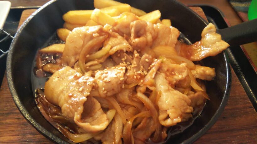 テーブルに運ばれてきた瞬間、まず目を引くのは、じゅわあっという音とともに、鉄板の上で湯気を立てる焼肉。香ばしく焼けた豚肉と玉ねぎが艶やかに輝き、ふわりと甘辛い香りが立ちのぼる。箸で持ち上げると、しっとりと柔らかく、噛むほどに肉のうま味が口の中で広がる。濃すぎない味付けで、ご飯との相性は抜群だ。