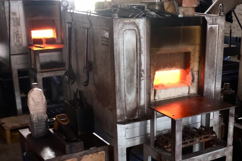 早速待っていたのが鍛造用の作業場。鍛冶仕事のイメージといえばこれを思い浮かべる人は多いだろう。とは言え、またも驚くのは作業場との近さだ。取材時は残念ながら作業休止中の時間帯だったが、炉のすぐ近くにまで迫ることができ、その熱気に圧倒された。