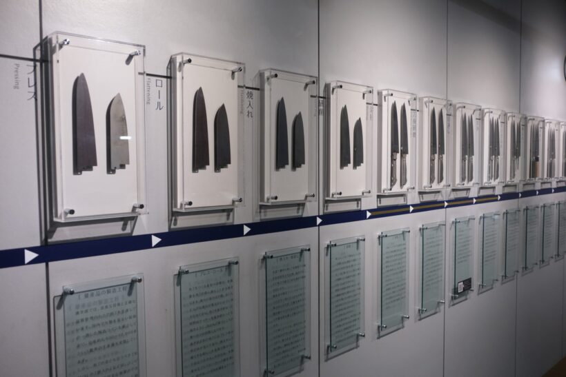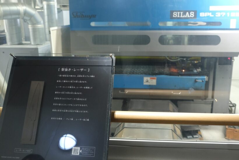 「ファクトリー」では、一部非公開の部分はあるものの、製造工程の多くを見学可能。素材から包丁の形を切り抜くところから最後の洗浄まで、順を追って見ていくことができる。