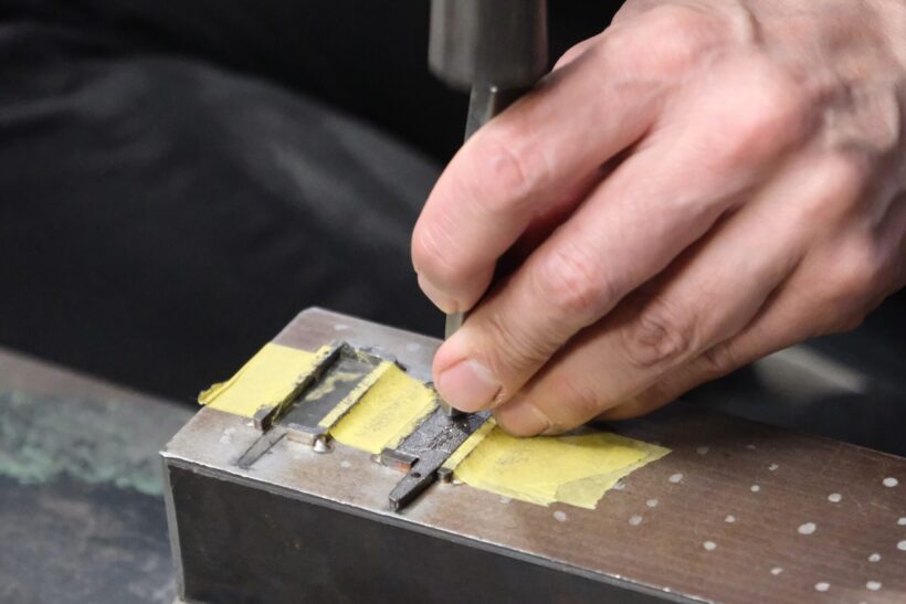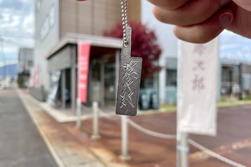 ナイフアトリエ責任者の松村智郎さんは、藤次郎でも数少ない、包丁に銘を彫る「作切り」に携わる職人だ。取材時に偶然出会ったが、なんと、筆者の名前と「藤次郎」の文字を彫った金属製のキーホルダーをいただいた。松村さんの手が空いているタイミングでしかやっていないサービスだという。