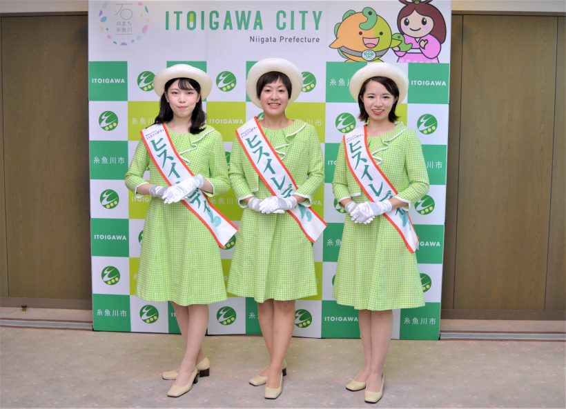 新潟県糸魚川市は31日、イベントやキャンペーンへ出向いて糸魚川市をPRする「糸魚川市観光大使ヒスイレディ」の令和3年度の新たな3人の認証式を糸魚川市役所で実施した。任期は2年で、年齢は今回から非公表となる。