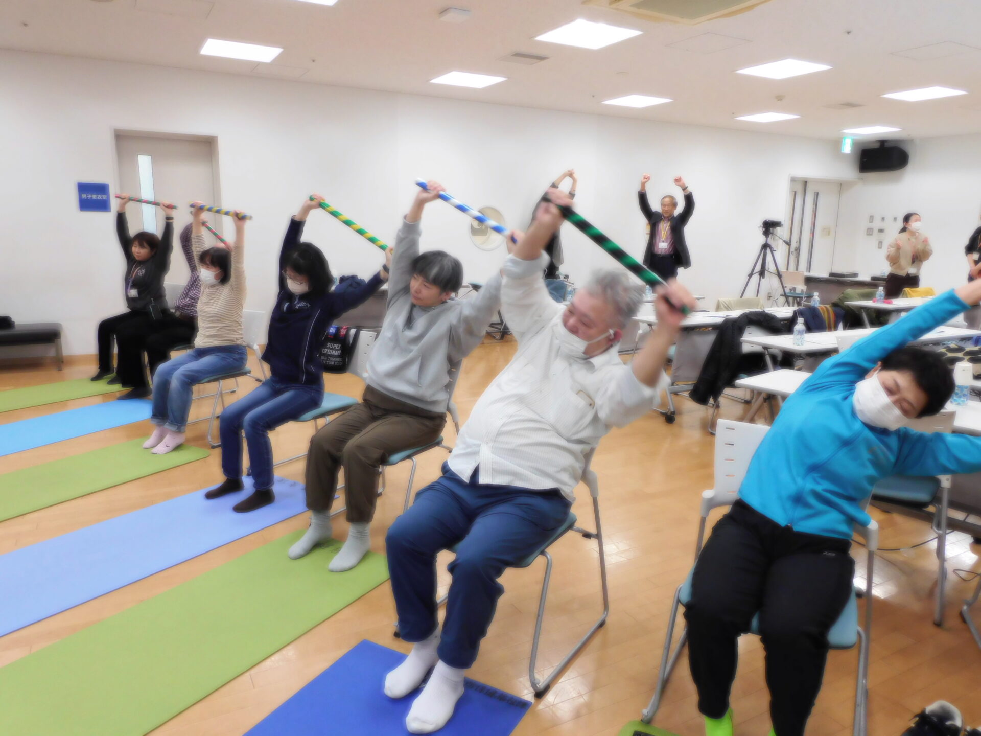 講座では、髙橋ブロック長は特に、転倒防止や誤嚥(ごえん)予防について触れ、日常生活の中でこれらを防ぐことの重要性を、自身の経験などから得た事例とともに強調した。後半は、普段の生活の中で無理なくできる、身体機能の低下を防ぐためのストレッチなどを紹介。参加者は体を軽く動かしながら、介護予防の考え方や方法を学んだ。