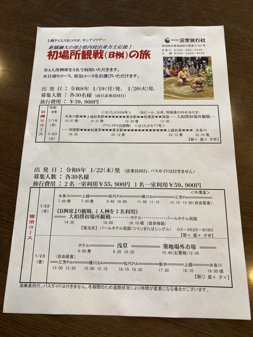 やはり人気の横綱大の里を抜きに語れない。新潟県立海洋高校(糸魚川市能生)出身の大の里は国民的人気力士になりつつある。地元紙「上越タイムス社」とのコラボによるサンアイツアー『初場所観戦の旅』(日帰り・宿泊両コース)も企画されている。大相撲観戦ツアーだけでなく、海洋高校相撲部のけいこを見学する旅も準備中だ。海洋高校のある能生は能生漁港もあり、魚も豊富な魚市場があるほか、小泊にはズワイガニなどの「カニや横丁」も有名だ。大の里とカニをコラボして、三愛旅行社の企画の旅はまだまだ続きそうだ。