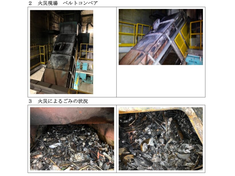火災が発生したのは、不燃ごみ処理を行うリサイクル設備の粗破砕機から、細破砕機に不燃物を搬送するベルトコンベア。不燃ごみに混ざっていたリチウムイオン電池製品が、破砕作業による衝撃で発火したと推定される。