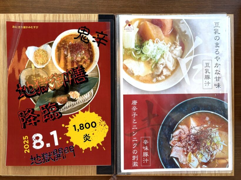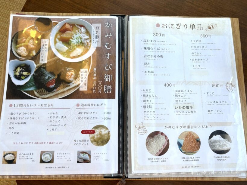 メニューは、おにぎりや豚汁、おかずが単品で注文できるほか、おすすめは定食とのこと。具材が選べるおにぎりは、定番から創作まで幅広く、組み合わせ次第で印象が変わる。豚汁も、通常の豚汁に加え、豆乳を加えたまろやかな「豆乳豚汁」や、唐辛子とにんにくが効いた「辛味豚汁」も用意されている。今回キシャは、店の人気メニュー「かみむすび御膳」を注文。おにぎり2種、豚汁、小鉢がつくバランスのいい定食だ。