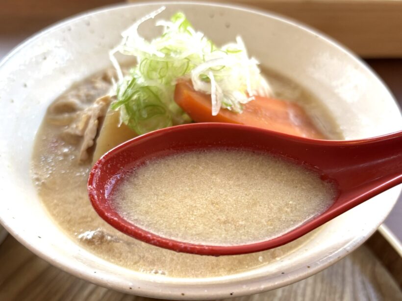 そして今回特に印象に残ったのが「豆乳豚汁」。白くやわらかい色合いで、見た目からして優しい。口に含むと、豆乳のコクが広がりながらも重たくなく、豚肉や根菜の旨みをしっかりと受け止めている。じんわりと体の芯が温まり、思わず「もう一杯」と言いたくなる味わいだ。具材もゴロゴロと大きくカットされており、とても食べ応えがあった。