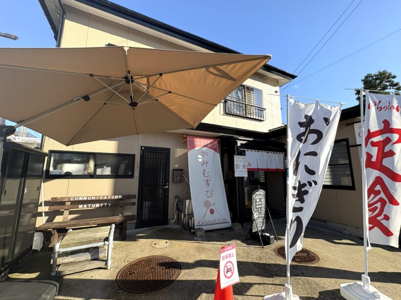 この日は取材で田上を訪れた。田上に来たら、必ず立ち寄りたくなるのが道の駅だが、今日はお目当ての店があった。町役場から車で約7分、国道403号沿いの加茂暁星高校へ行く交差点脇に、静かに暖簾を掲げる「かみむすび」。なんだか神々しい名前のおにぎり店である。