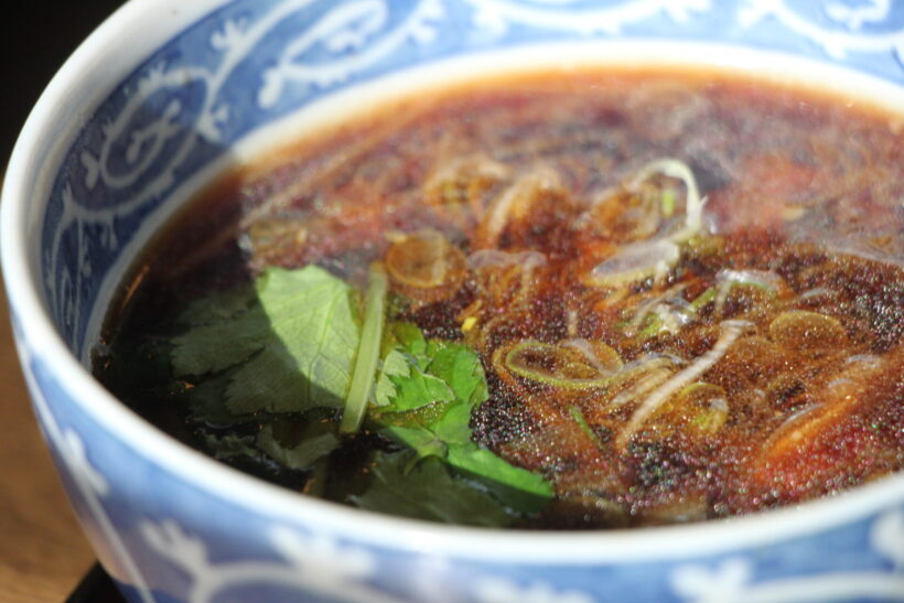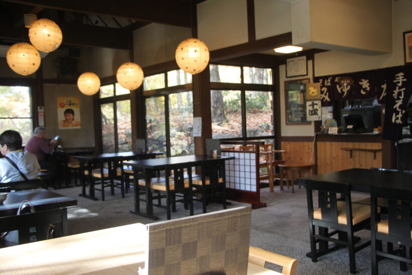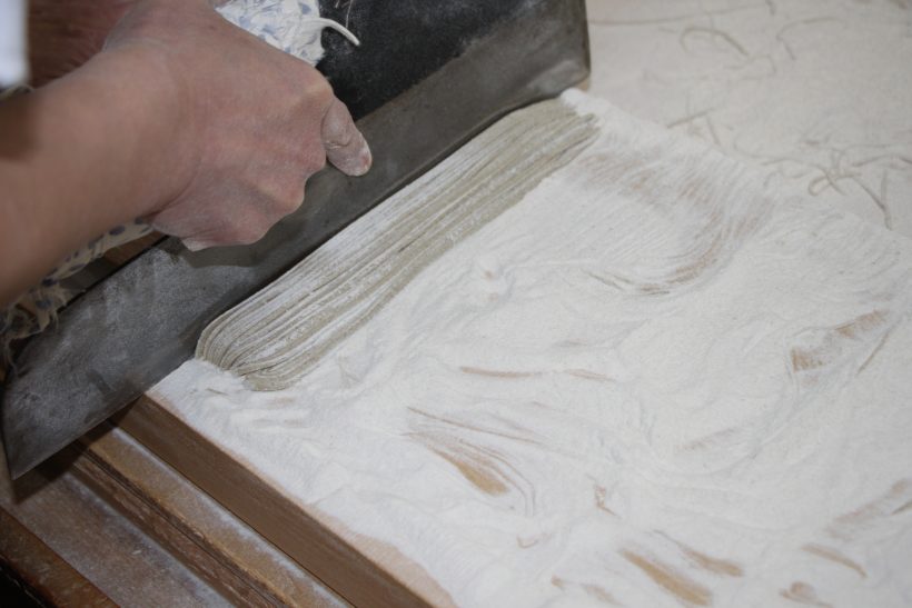 店に入ると、まだ平日の昼前、オープン直後にもかかわらず先客がいる。こういう名店が胎内高原の山懐にある。店内のブース内では蕎麦打ちが「実演」されている。この姿を見ると、蕎麦喰いはがぜんテンションが上がる。挽きたて、打ちたて、茹でたての三たてを良しとする蕎麦の世界、蕎麦打ちの姿が見られるのは、こちら側の体感に影響してくるのだ。